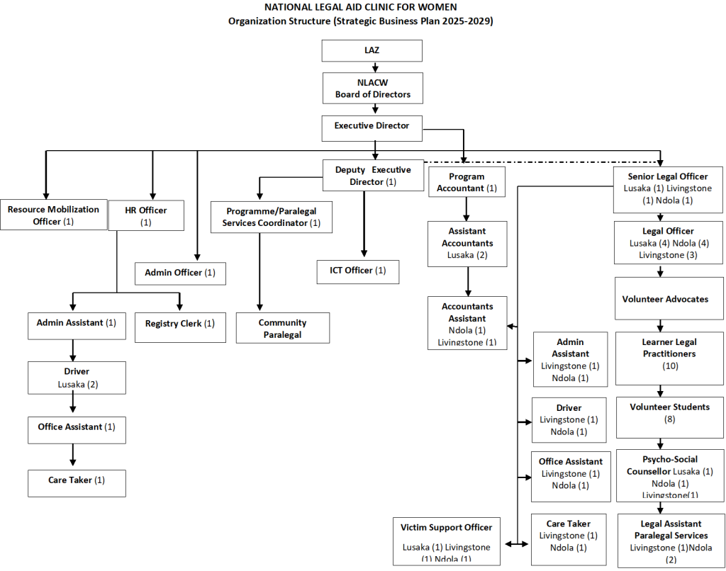 The Executive Director (ED) is the chief executive officer of NLACW and is also an ex-officio member of the Board of Directors. The Deputy Executive Director who is also responsible for monitoring and evaluation supports the ED. The other staff in senior management includes the Senior Legal Officers, Human Resources Officer and the Programmes Accountant.